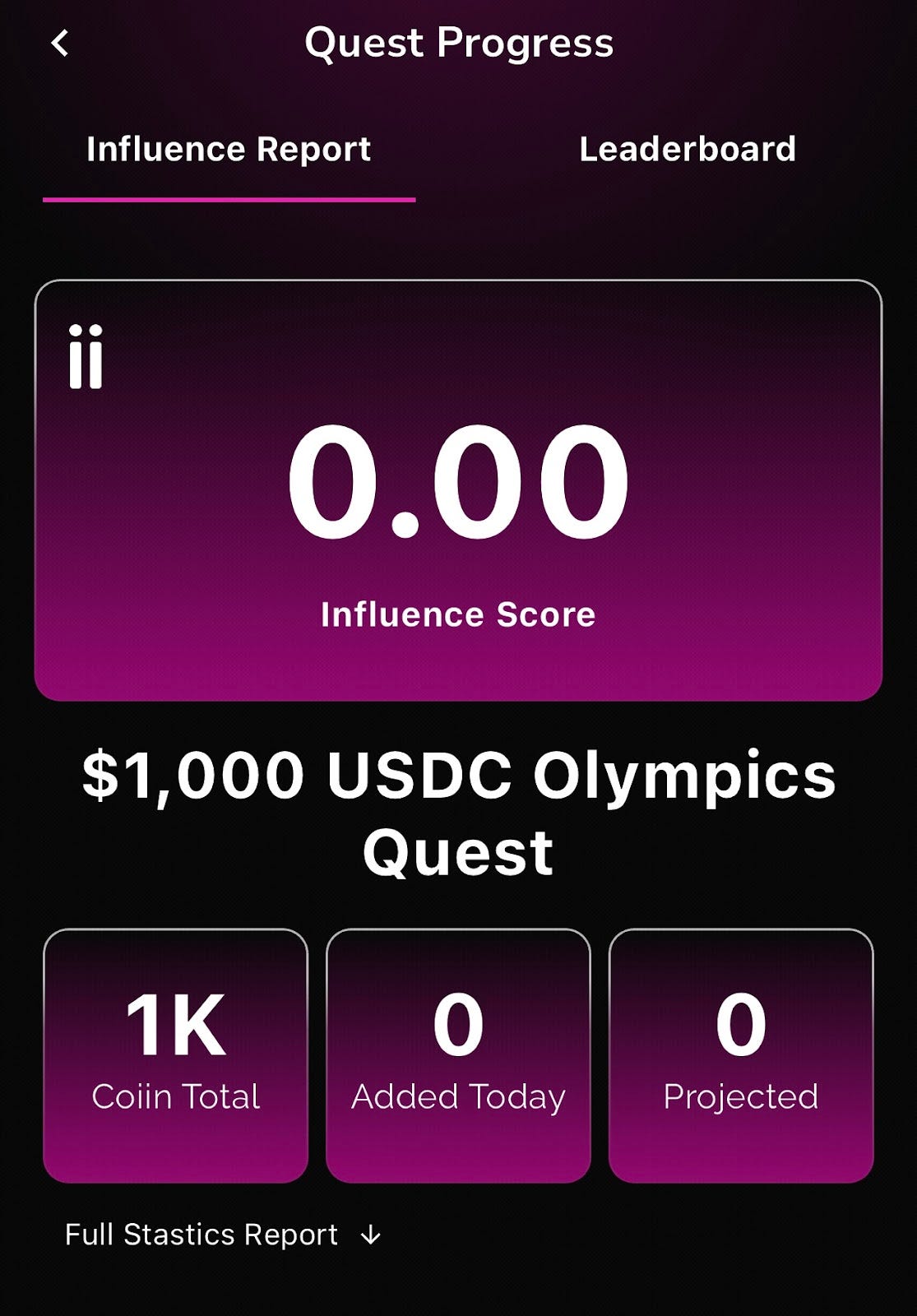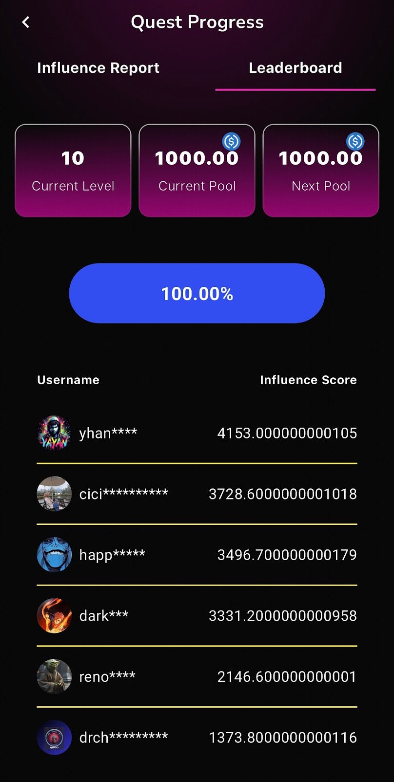 View Influence Button: This button takes you to an information page detailing the Quest Progress. The “Influence Report” provides participants with data such as the Influence Score and the total amount in the prize pool. It also has a full statistics report button that redirects you to more advanced data relating to the quest.