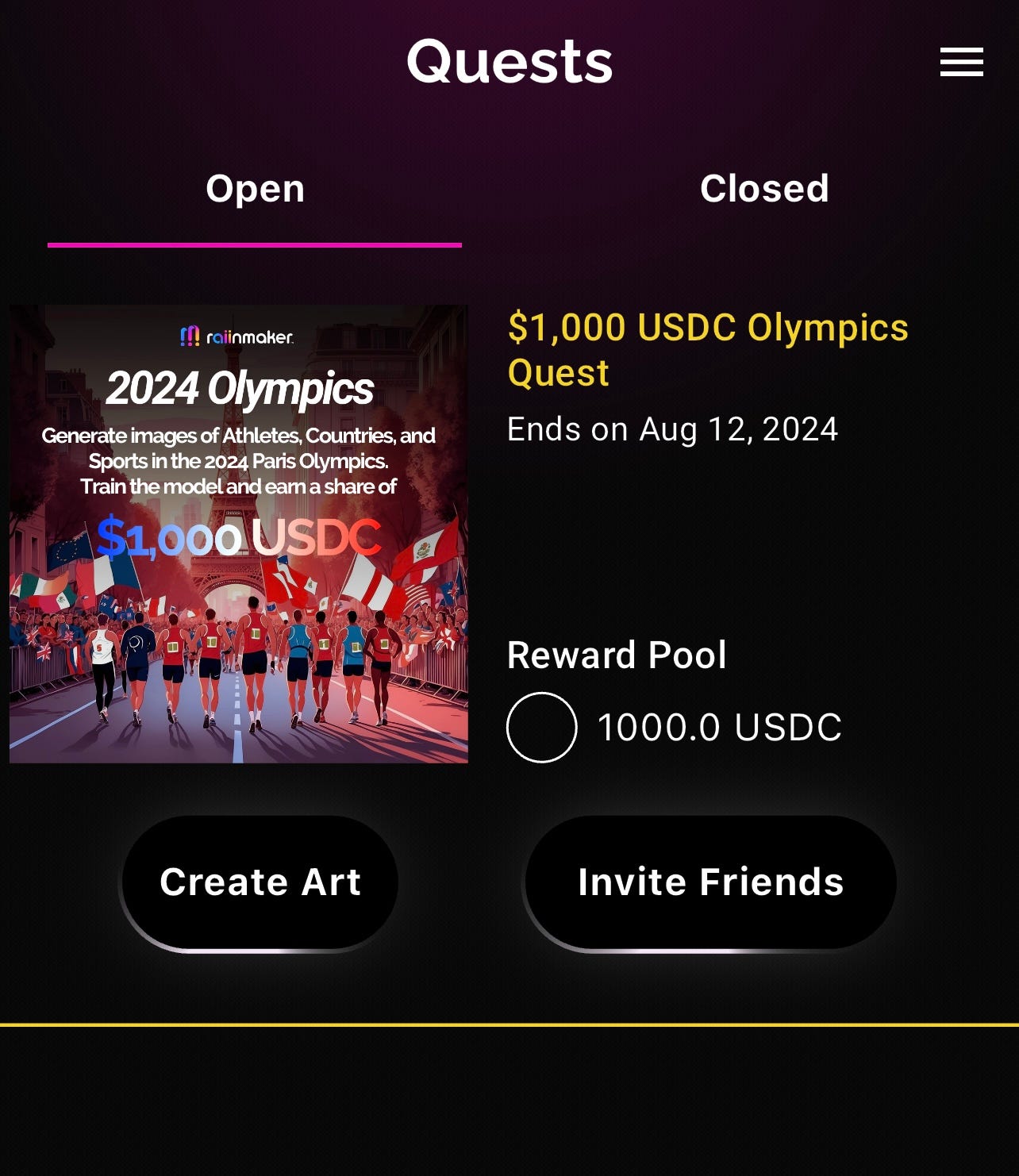 Open quests are a way to view the list of quests you actively participate in. Quests on Raiinmaker require simple image prompting and an entry-level of creativity.